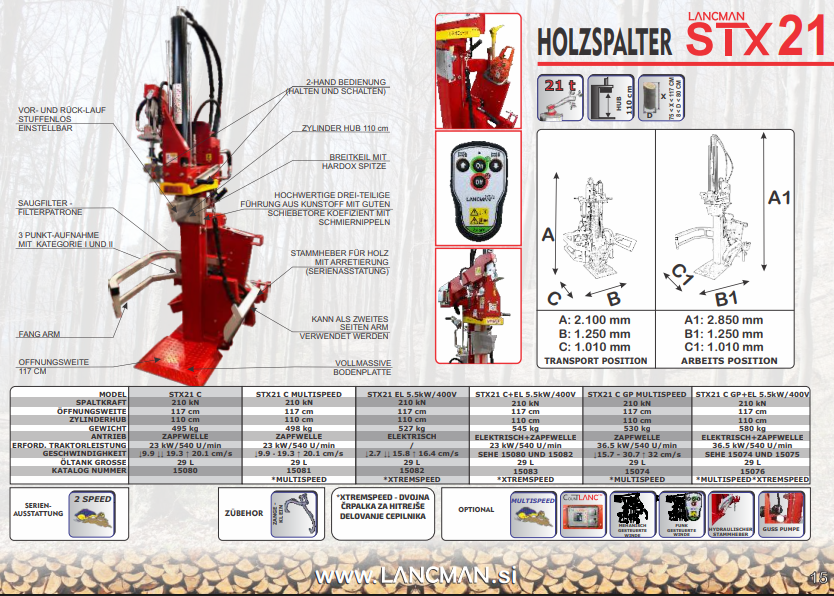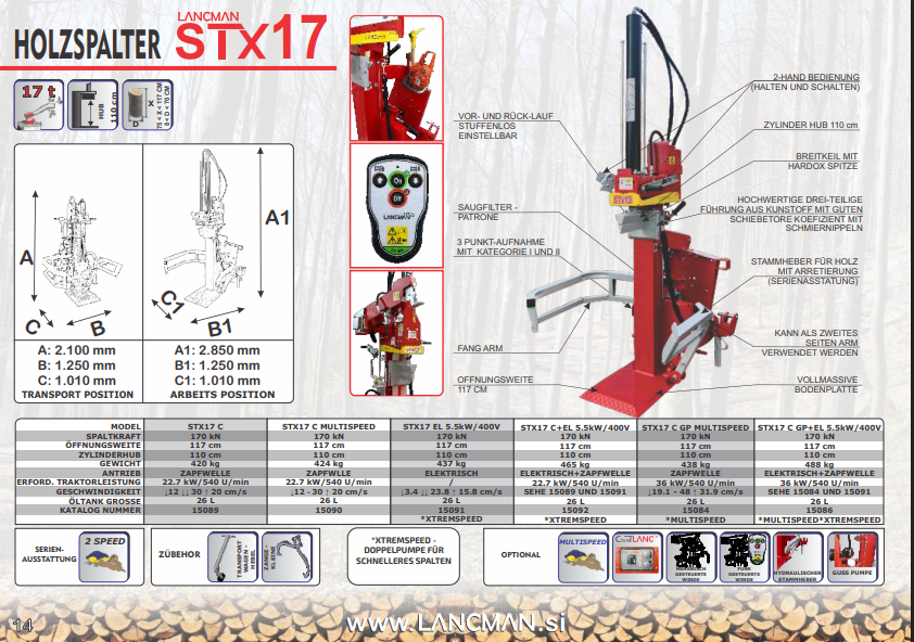 Spalthub: 110 cm, max. Spaltlänge: 117 cm, max. Stammdurchmesser: 95 cm