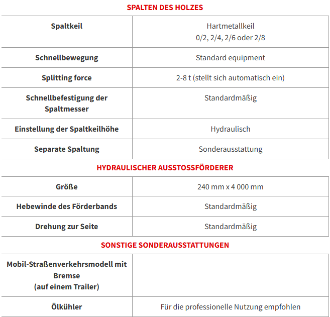 Die Spaltkraft- und Geschwindigkeit der Pilkemaster EVO 36-Säge-Spalt-Automaten stellt sich automatisch auf die Größe und Härte des Holzes ein. Durch die Nutzung verschiedener Keile kann in 2 - 8 Teile gespalten werden. Die Höhe des Spaltkeils wird hydraulisch eingestellt, wodurch diese Arbeit schnell verrichtet wird. Dank der einzigartigen Spaltmechanik können Sie mehrere kleinere Stämme gleichzeitig sägen und sie mit einer Schubbewegung spalten! Die Maschinen der EVO-Serie bieten auch eine separate Spaltfunktion, mit der bereits gespaltenes Holz noch kleiner gespalten werden kann.