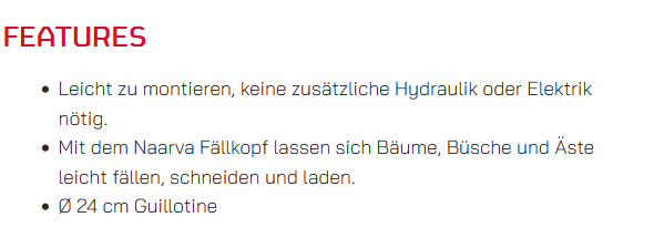 Naarva K-Modelle sind zuverlässige Kombinationen von Fällkopf und Ladezange. Sie eignen sich für alle Rodungs- und Durchforstungsarbeiten. Mit dem Naarva Fällkopf K 24 lassen sich Bäume, Büsche und Äste leicht fällen, sammeln, schneiden (24 cm Guillotine-Schneide) und laden. Der Naarva Fällkopf kann an Stelle des eigenen Lade- oder Harvesteraggregats des Krans ohne Zusatzhydraulik schnell angeschlossen werden.