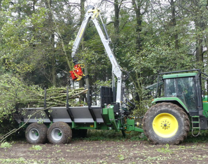 Die gefällten Bäume oder Büsche können direkt auf die Lkw-Ladefläche gehoben werden, wodurch die Rodung auch in engen Stellen sicher und effizient erfolgt. Dank der großen Reichweite des Krans sind das Zerlegen und Kürzen auch von großen Bäumen vom Wipfel abwärts möglich.