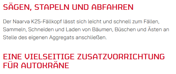 Naarva K-Modelle sind zuverlässige Kombinationen von Fällkopf und Ladezange. Sie eignen sich für alle Rodungs- und Durchforstungsarbeiten. Mit dem Naarva Fällkopf K 25 lassen sich Bäume, Büsche und Äste leicht fällen, sammeln, schneiden (effiziente, starke Guillotine 25 cm) und laden. Der Naarva Fällkopf K 25 kann an Stelle des eigenen Lade- oder Harvesteraggregats des Krans ohne Zusatzhydraulik schnell angeschlossen werden; Funksteuerungsmöglichkeit.