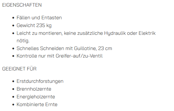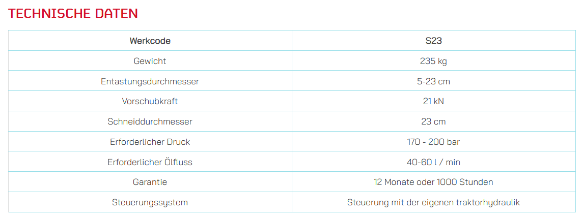 Die Modelle S23 und S23C sind leicht und einfach zu montierende, stromlose Schubharvester. Mit S23 können Sie fällen, entasten, hacken und bei Bedarf noch in Holzscheite mit bestimmtem Maß spalten. S23C ist mit einer Schneidsäge ausgestattet und eignet sich besonders zum Schneiden von hartem Holz. Der Schubharvester S23 oder S23C wird an Stelle des Ladegreifers montiert und es sind keine Kabel, zusätzliche Schläuche oder Steuergeräte notwendig. Alle Funktionen des Schubharvesters werden mit dem auf/zu-Ventil des Ladegreifers betätigt.