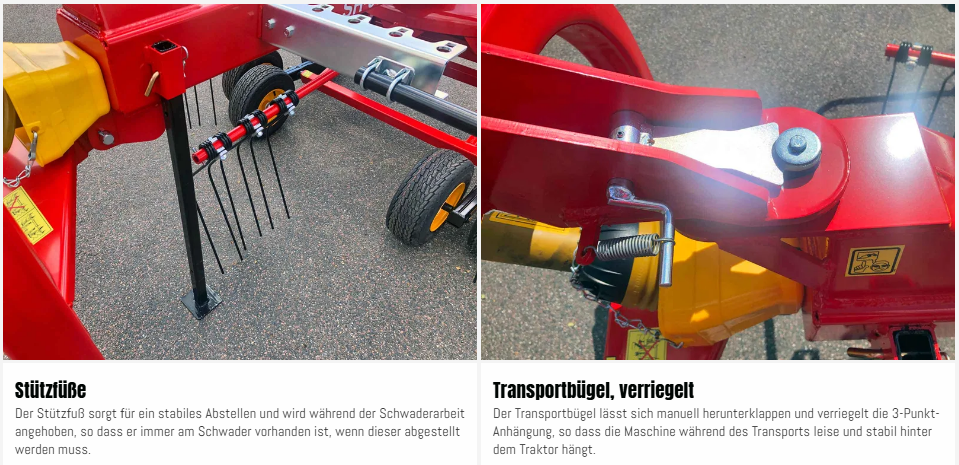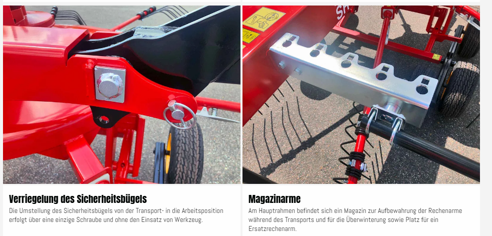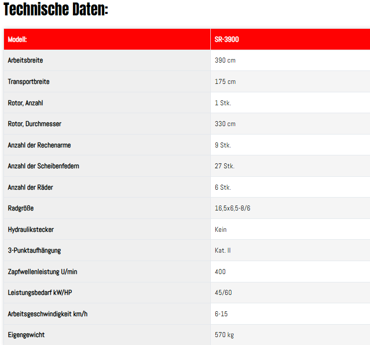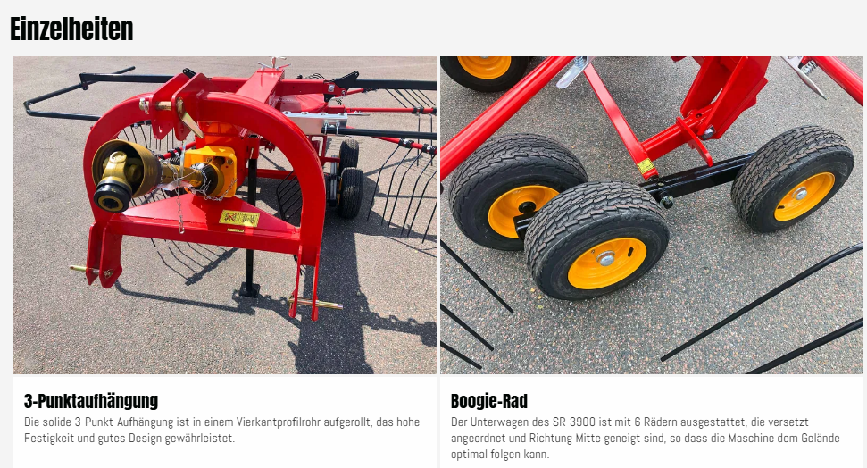 Der SR-3900 ist auf einer hochbelastbaren Aufhängung mit Transportsicherung aufgebaut. Das Boogie-System mit 6 Rädern sorgt für einen reibungsloseren und gleichmäßigeren Arbeitsablauf. Die Neigungsführung unter dem Rotor hat 3 Einstellungen, um ein optimales Zusammenführen und ein perfektes Schwaden zu gewährleisten.