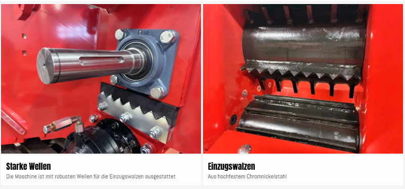 Jede Walze wird von einem eigenen Hydraulikmotor angetrieben. Das Planeten- und Schneckengetriebe an den Walzen erhöht die Einzugsleistung. Die Einzugsgeschwindigkeit ist stufenlos regelbar. In Kombination mit der Drehzahlüberwachung lässt sich die Maschine optimal an jede Aufgabe anpassen.