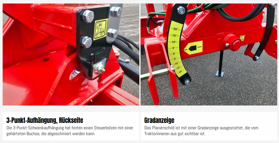 GT-DKH setzt einen neuen Standard im professionellen Planieren. Das Tüpfelchen auf dem i ist die 3-Punkt-Anhängung, bei der der horizontale Winkel zwischen Ausleger und Anhängung auf 20° zu jeder Seite eingestellt ist, wodurch die Hubarme des Traktors nicht belastet werden. Das reduziert den Verschleiß und damit die Kosten.