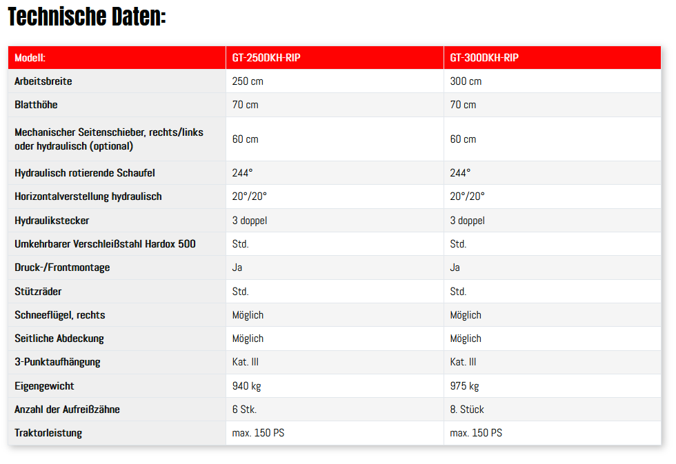 Die Aufreißer können hochgeklappt und geklemmt werden, so dass die Maschine wie ein Standardmodell arbeiten kann, wenn der Boden locker genug ist. Daher ist ein RIP-Modell flexibler als ein Standardmodell. Die Aufreißer können für die Modelle GT-DK, GT-DKH und GT-AUS bestellt werden. Sie können nicht nachgerüstet werden und müssen daher bei der Bestellung als RIP-Modell bestellt werden.
