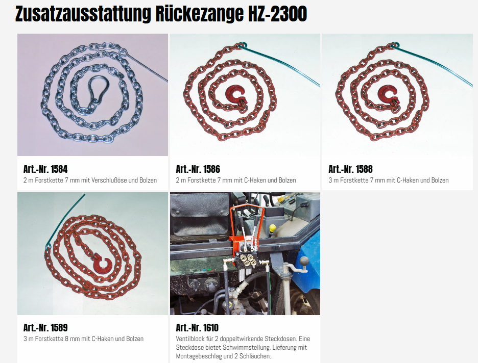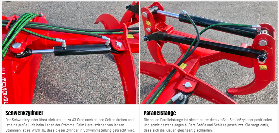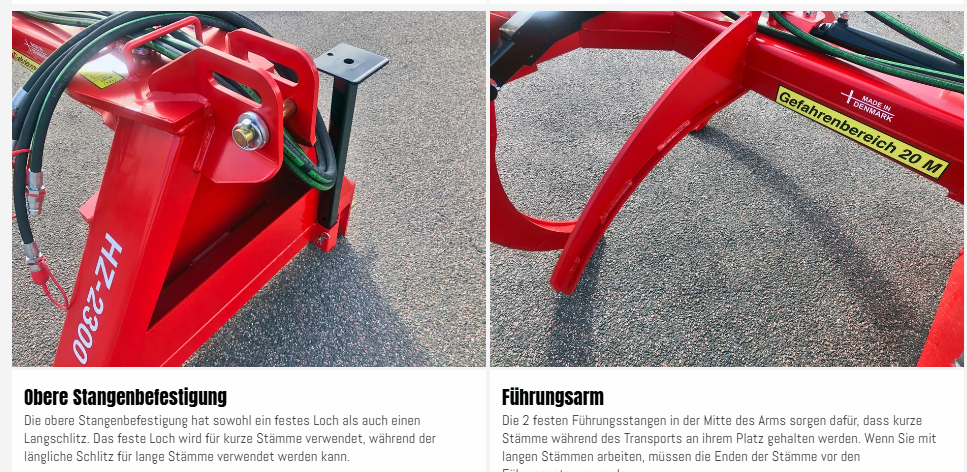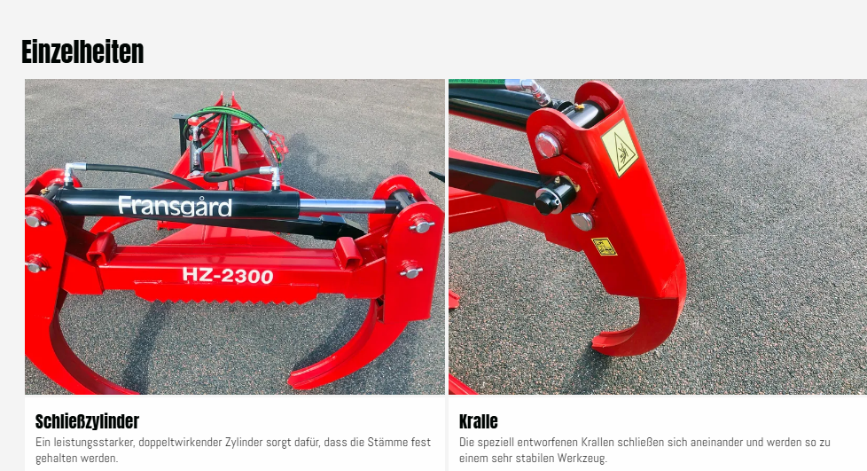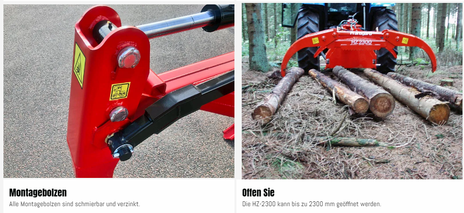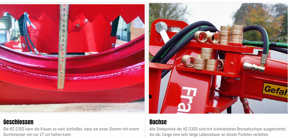 Die HZ-Rückezange von Fransgård ist sehr robust und stabil und wird an vielen Orten der Welt eingesetzt. Die robuste Grundkonstruktion und die Messingbuchsen in allen Gelenken machen die Rückezange sehr langlebig und robust, so dass sie für die meisten Aufgaben im Wald geeignet ist. Die HZ-2300 hat eine Öffnungsweite von 2,3 m.